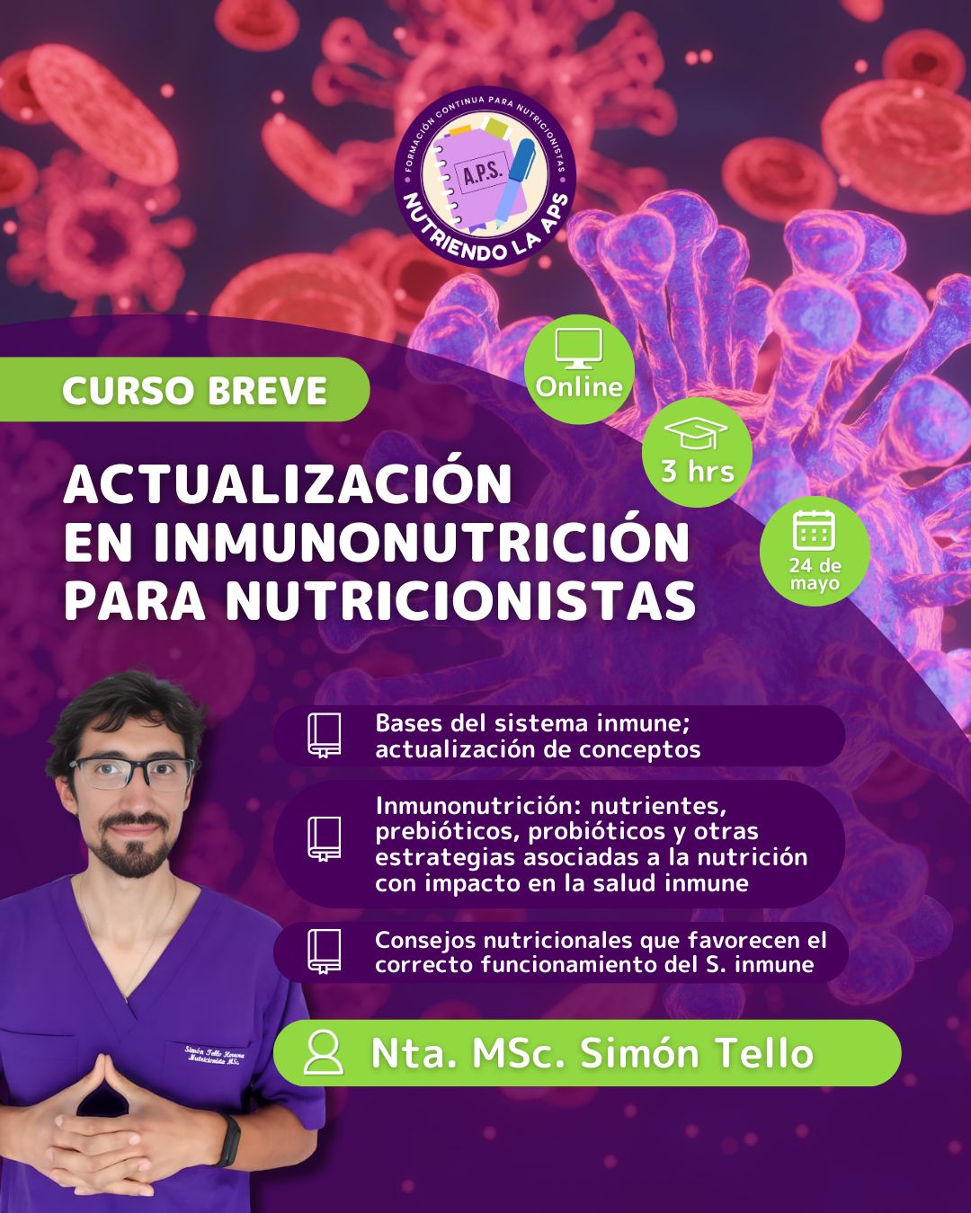 Te invitamos a participar en nuestro Curso Breve de Nutriendo la APS, diseñado para fortalecer el conocimiento de los nutricionistas en estrategias nutricionales que favorecen el sistema inmune.